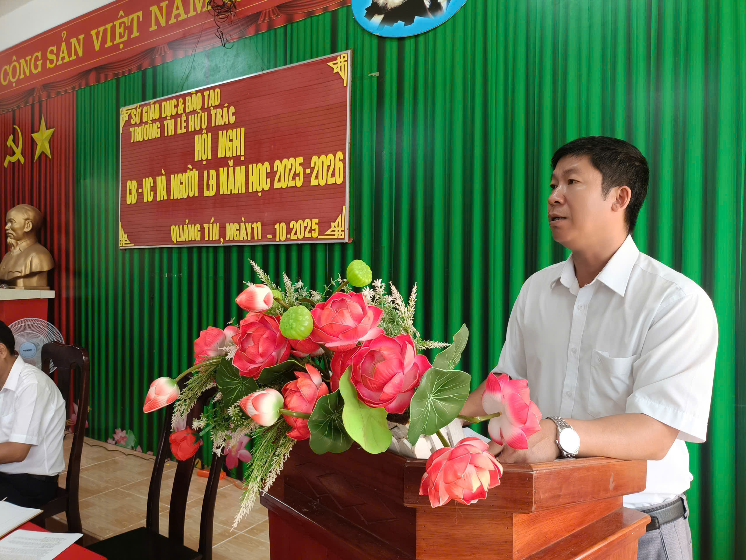 Tham dự và chủ trì hội nghị có: Hiệu trường Ông Bùi Đức Duy, phó hiệu trưởng Ông Nguyễn Văn Đồng và Ông Nguyễn Hữu Nam, toàn thể các bộ viên chức người lao động trường TH Lê Hữu Trác