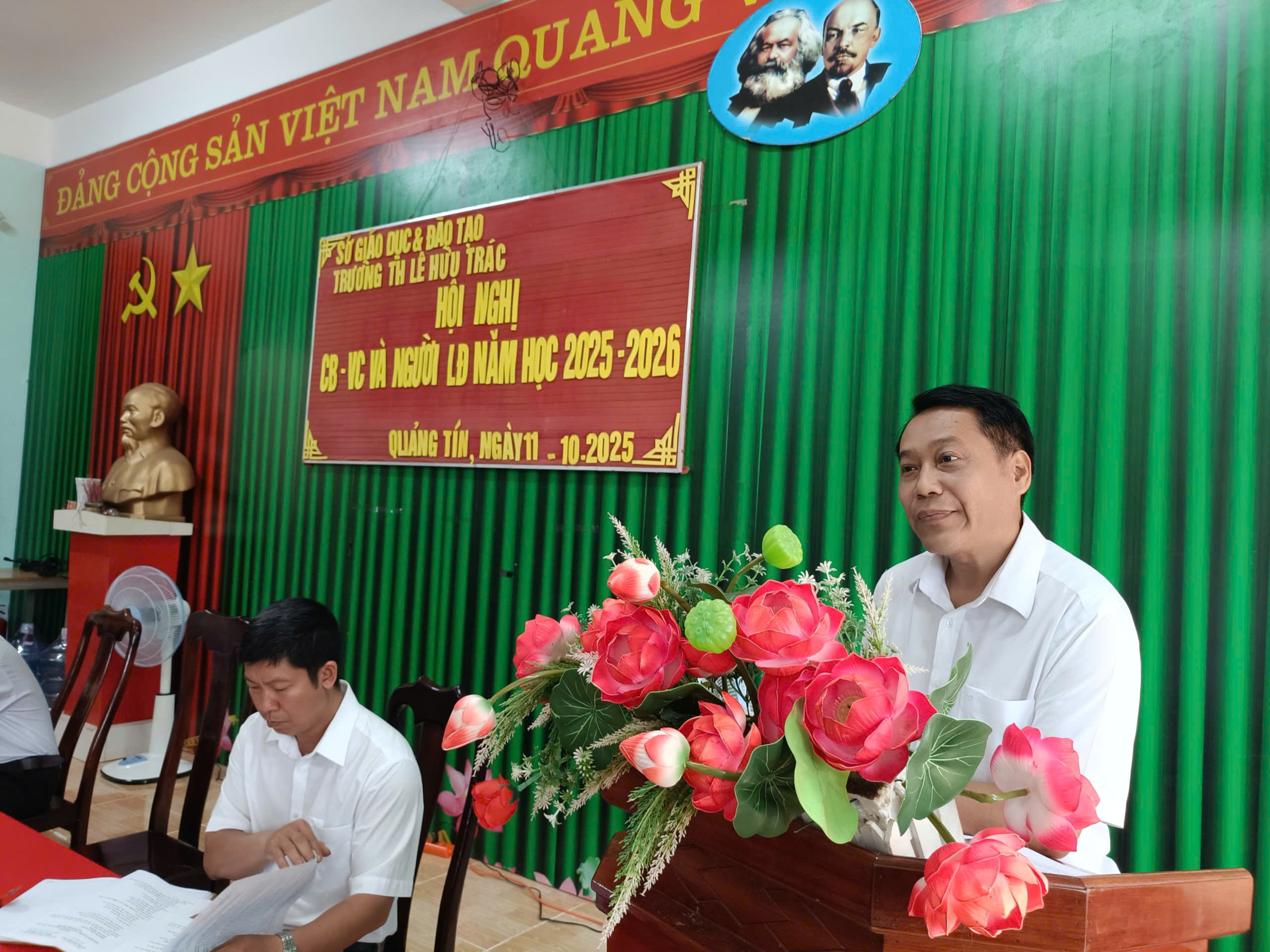 Với những ý kiến góp ý xây dựng từ cán bộ viên chức người lao động trong nhà trường thì Đ/c Hiệu trưởng chủ trì hội nghị quyết tâm cao xây dựng trường TH Lê Hữu Trác năm học 2025 – 2026 thành công và phát triển.